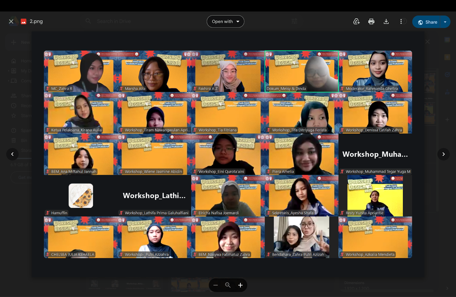The workshop began at 1:00 PM with an opening session led by the Master of Ceremony, followed by welcoming remarks from the Project Officer. Guided by the moderator, the main session featured Fakhira Az as the speaker. She delivered step-by-step explanations of design fundamentals, practical tips, and live demonstrations. The workshop encouraged participants to actively engage, experiment, and apply each concept in real time.