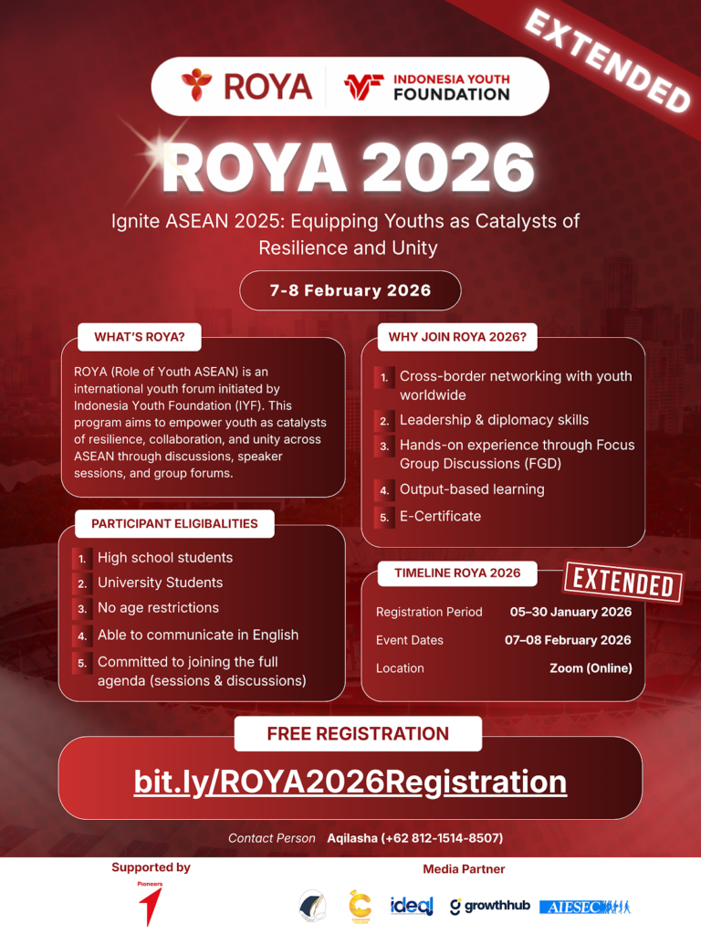 In the midst of rapid global change and regional challenges, the role of youth has never been more crucial. Young people are no longer merely future leaders. They are today’s decision-makers, innovators, and connectors. Responding to this reality, the Role of Youth ASEAN (ROYA) 2026) emerges as a regional youth empowerment platform that places young voices at the heart of ASEAN’s future.