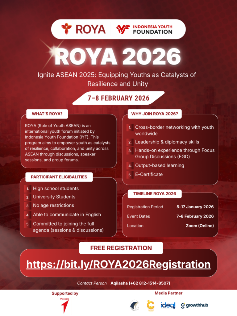 More than just a workshop, ROYA 2026 is a collaborative space where ideas evolve into action and youth voices translate into regional impact. By bringing together diverse perspectives and shared aspirations, ROYA 2026 invites young people to actively shape a more resilient, inclusive, and united ASEAN.